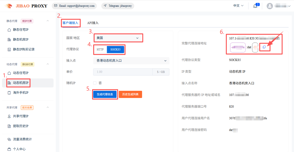 3. 点击左侧“动态机房IP” → 客户端接入 → 选择地区、代理协议等信息 → 点击“生成代理信息” → 右侧可复制IP信息,也可在“历史生成列表”里复制(支持HTTP、SOCKS5)。